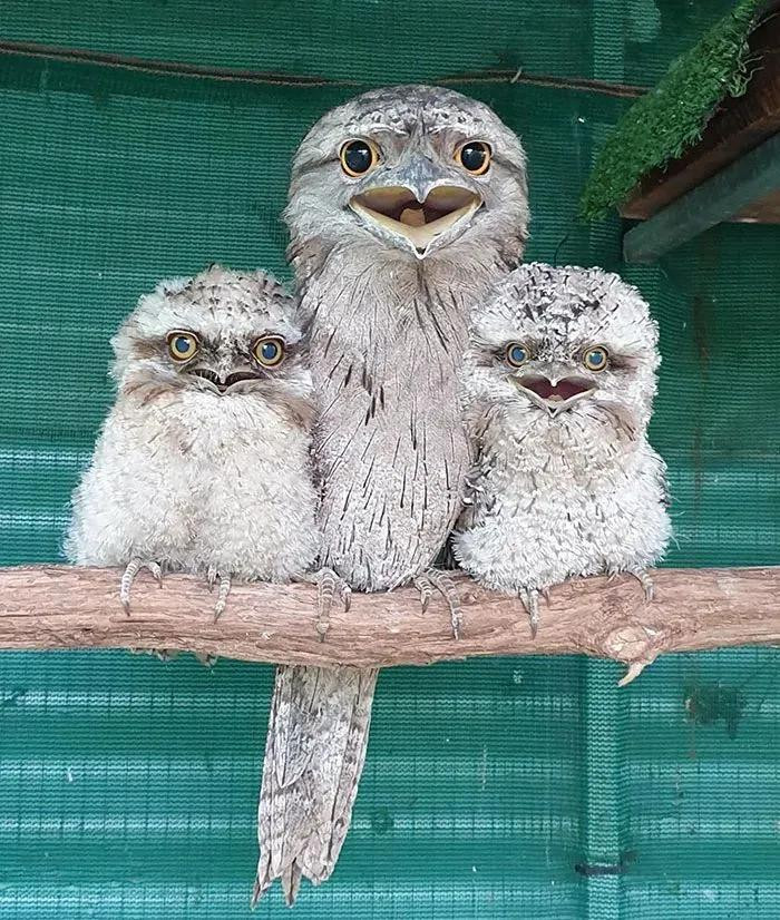 三只茶色蛙嘴夜鹰的亲子时光